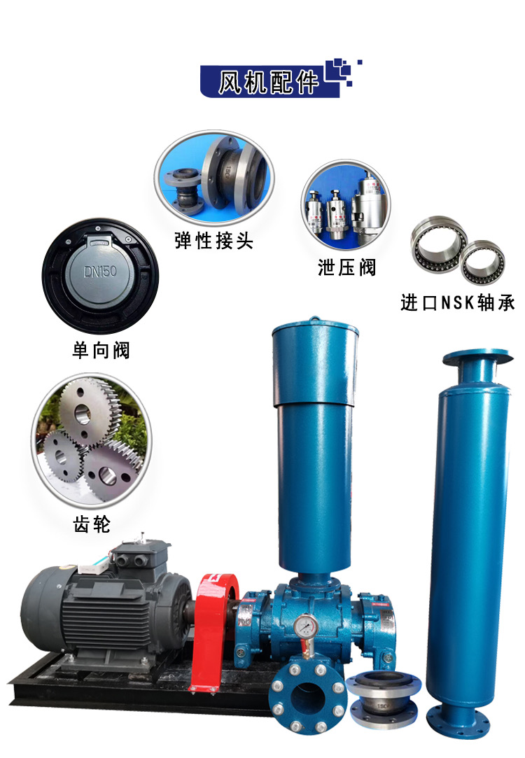 羅茨風機由:機殼、墻板、葉輪、油箱、消聲器五大部分組成。